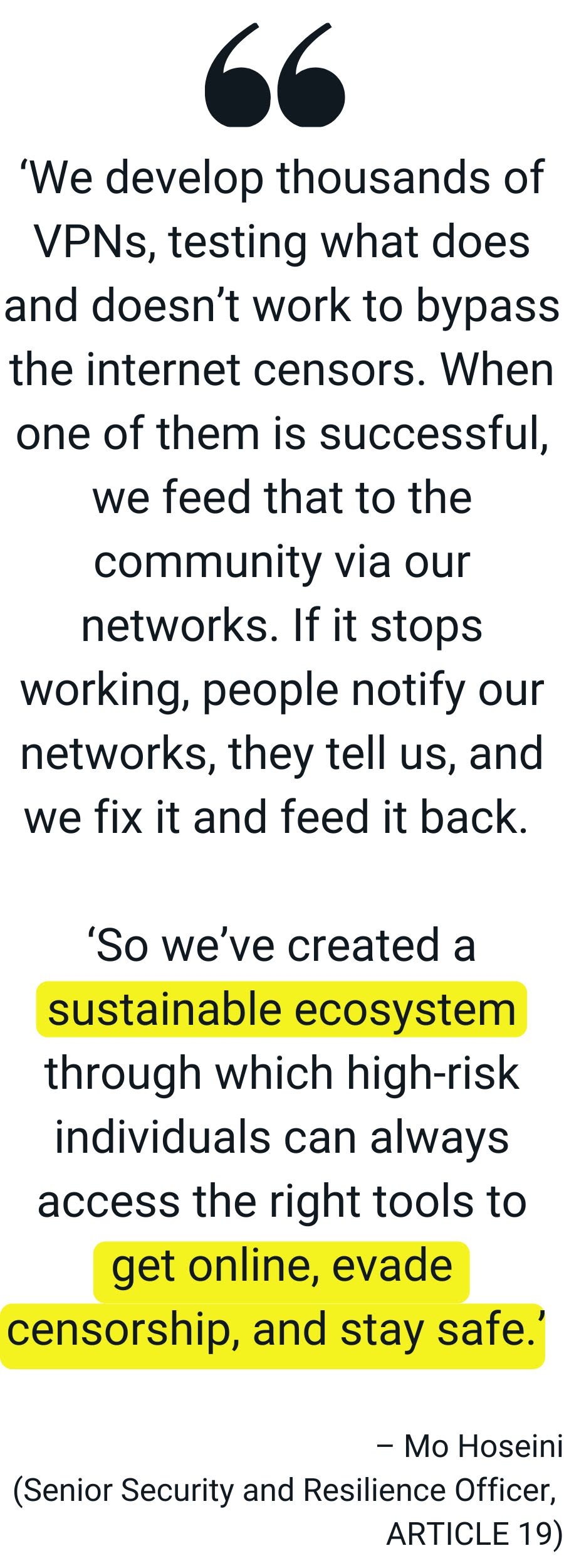 ‘Like recently [February 2024], there was an internet shutdown happening in Senegal. Because we’d created this francophone community, I reached out to ask what sort of support they needed on the ground. They said circumvention tools. So we are working on creating a broader understanding of the region with the VPN community to create the space for long-term transnational support through some of the tools available to the community during shutdowns.’
